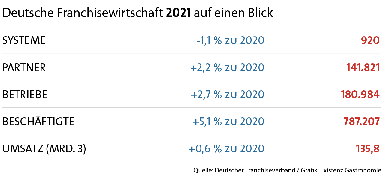 Obwohl es in fast allen Bereichen Lockerungen gegeben hat, ist die Corona-Pandemie überall noch gegenwärtig. Auch oder gerade deswegen sind in dieser Krisenzeit Franchisekonzepte besonders gefragt. „Unsere Statistik für das Jahr 2021 zeigt, dass auch in der Pandemie eine Zunahme an Franchisenehmern zu verzeichnen ist. Die Zahl der in Deutschland aktiven Franchisepartner stieg im Vergleich zum Vorjahr um 2,2 Prozent auf 141.821“, berichtet Jan Schmelzle, Geschäftsführer Deutscher Franchiseverband. Generell sei die aktuelle Situation jedoch schwierig zu bewerten. „Was sich zeigt, ist, dass die Anfragen im verbandseigenen Systemfinder deutlich gestiegen sind und die Gastrobranche unverändert nachgefragt wird. Mit einer bereits bekannten Marke und einem funktionierenden Konzept zu starten, ist wohl der größte Vorteil von Franchise, nicht nur in der Gastronomie“, führt der Franchise-Experte weiter aus.